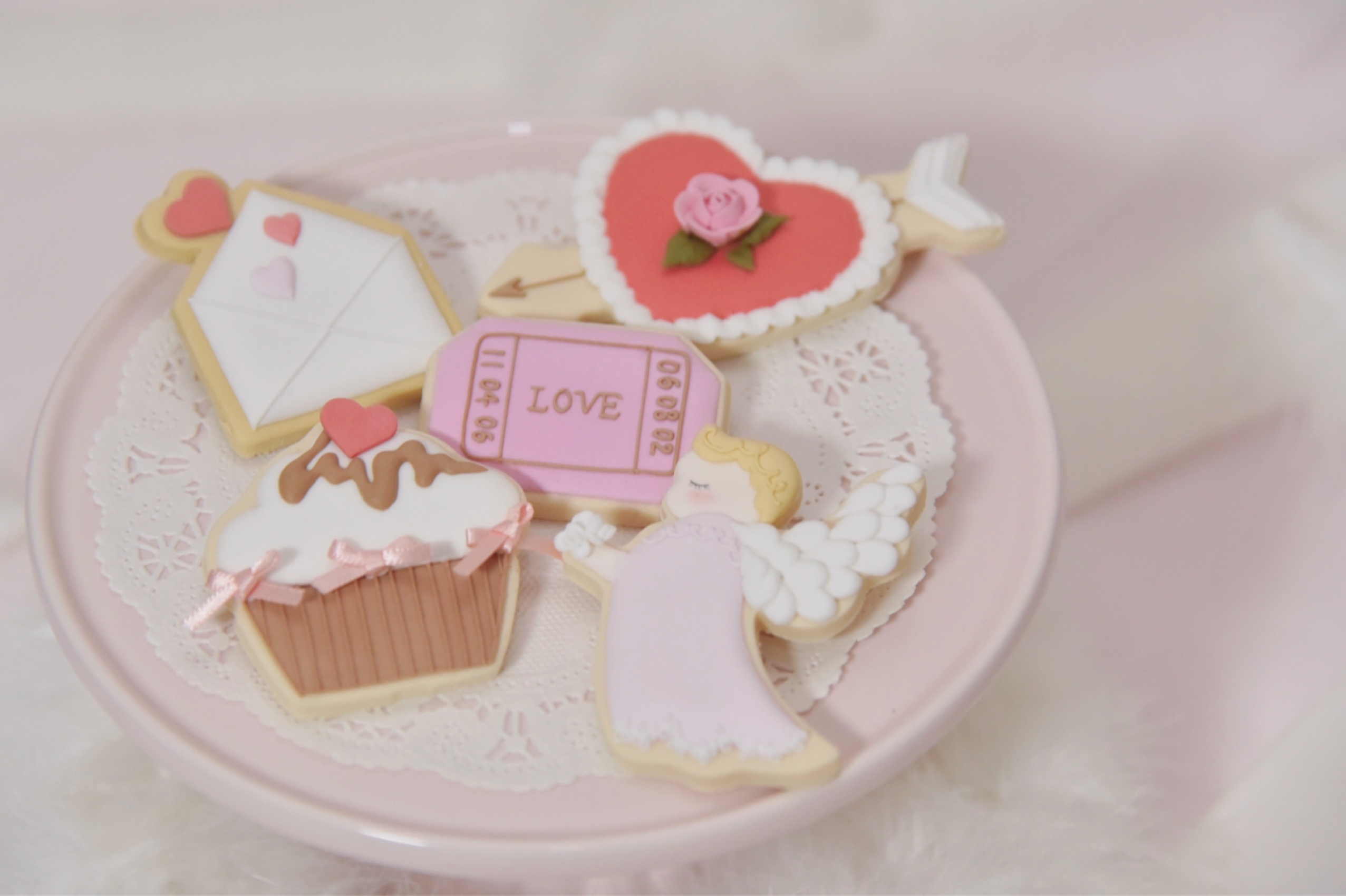 キューピット役の天使ちゃん、カップケーキ、ラブレター、タグ、ハートの5枚のクッキーをアイシングでデコレーションします。