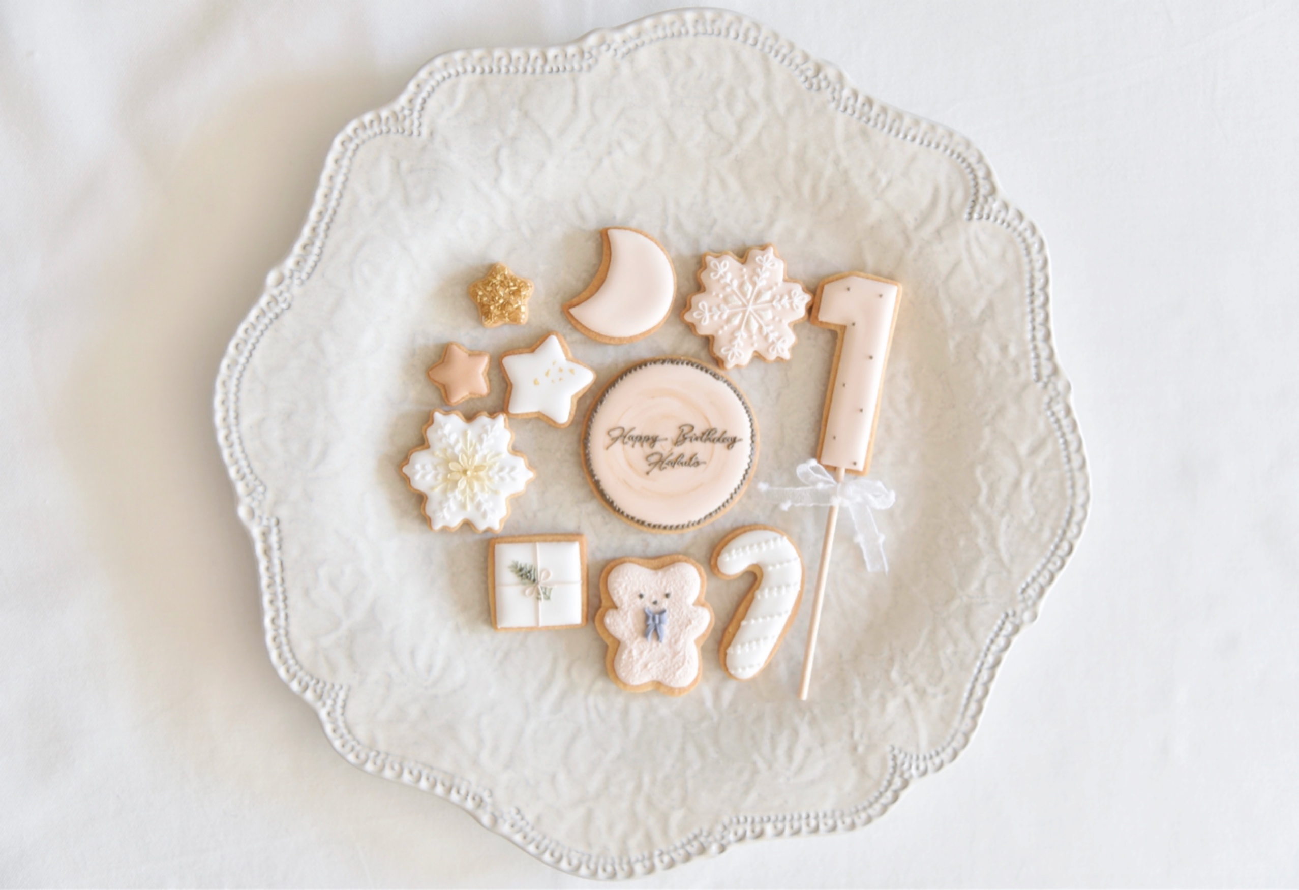 ベージュ、ホワイト系でクリスマスらしいモチーフも入れながらというリクエストでした。