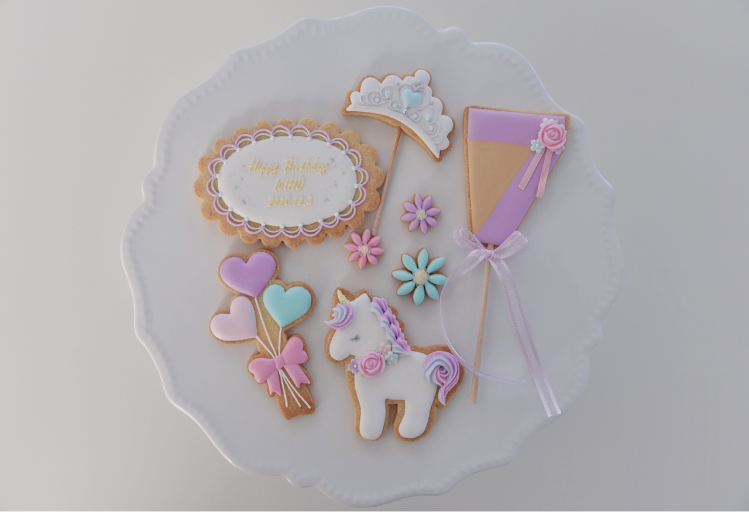 ユニコーンやバースデープレート、カラーは紫や水色がリクエストでした。
