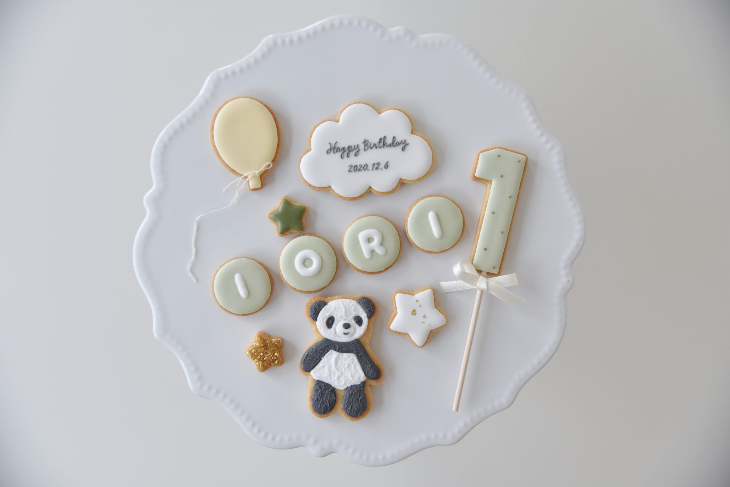 パンダのお人形で遊んでいるそうでパンダのモチーフ、色は淡いグリーンやイエローがリクエストでした。
