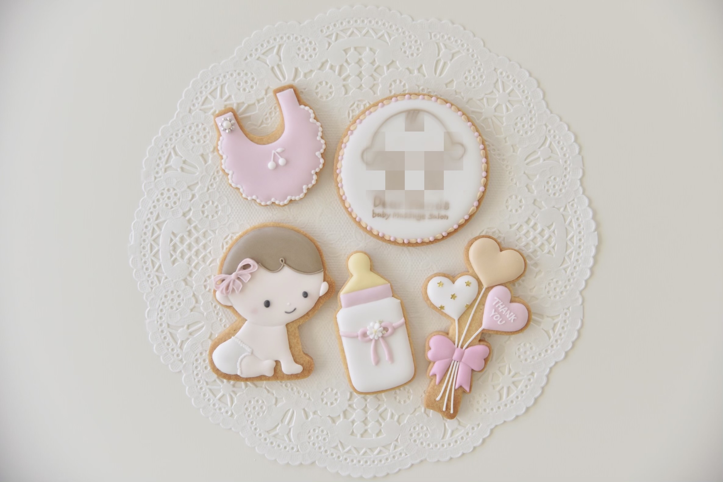 ピンク色でかわいらしく、赤ちゃん、お教室のロゴ、Thank youのメッセージといったリクエストでした。
