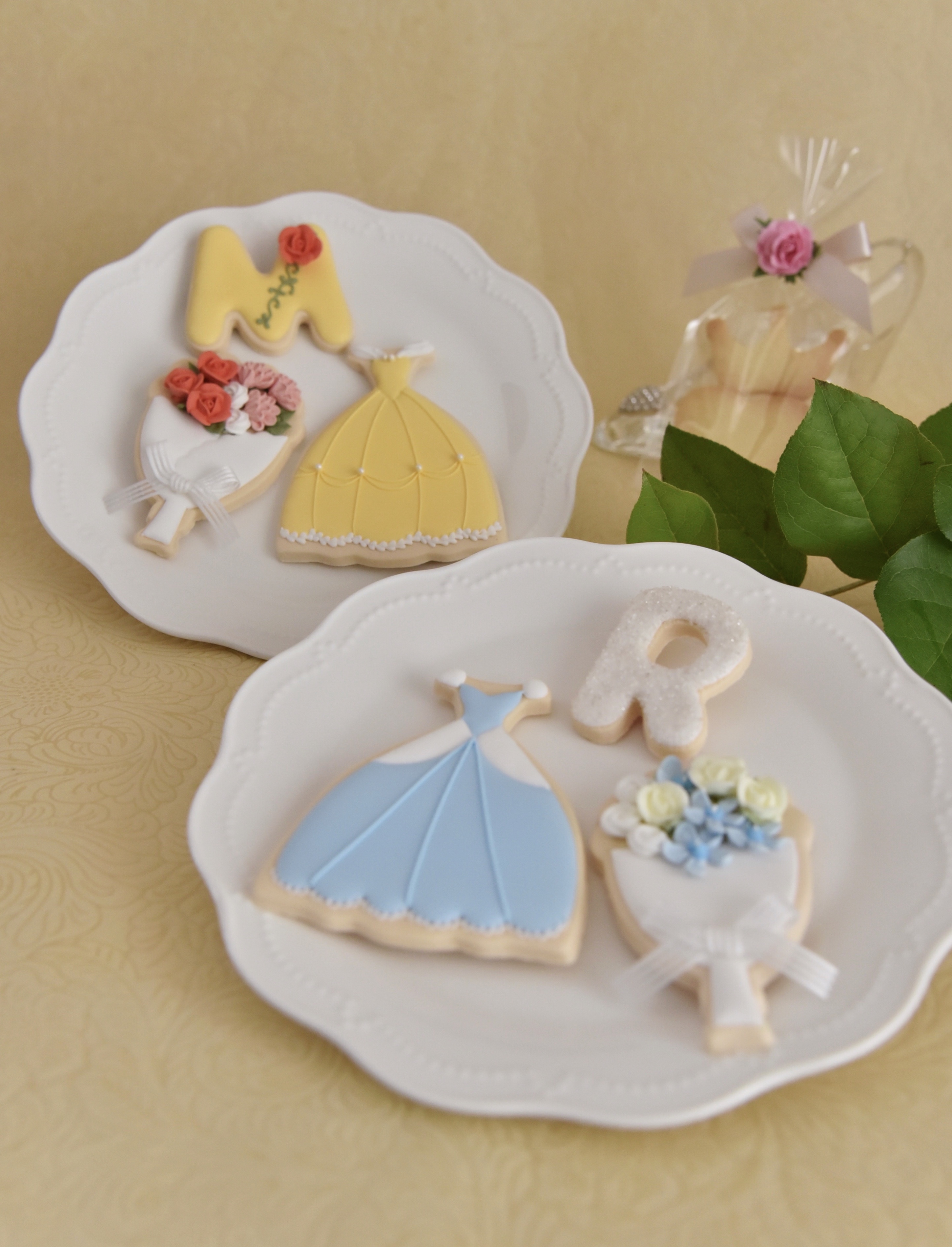 ドレス、花束、イニシャル(お申込みの際ご希望のものをお知らせください)の3枚のクッキーを作ります。